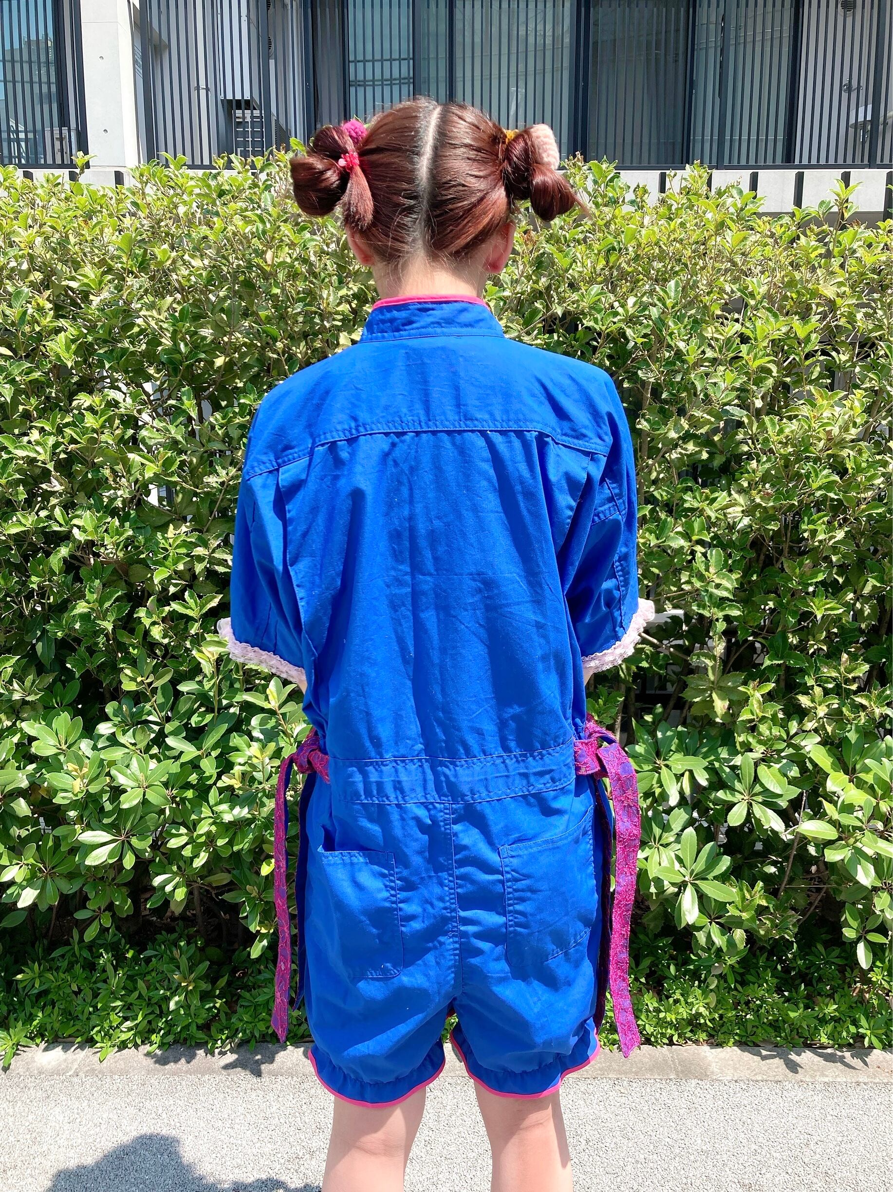 メンズLサイズの真っ青な作業用つなぎを女性が着てもゴツゴツしないように変更させながらチャイナ風リメイクをしました。